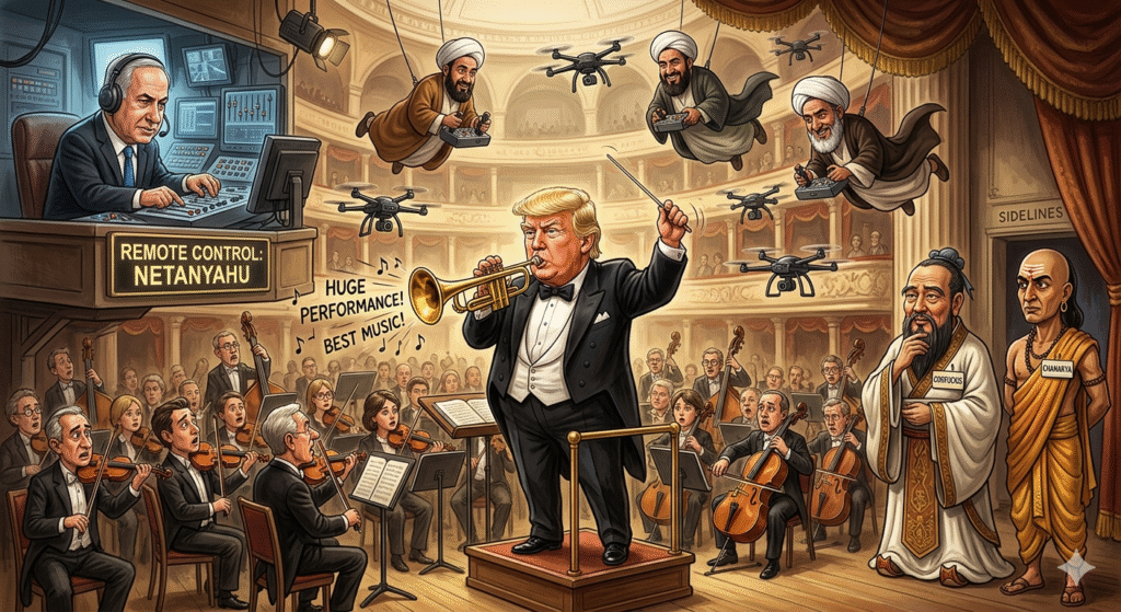 Don the Trumpeter is at a loss now, he inherited an orchestra, a full ensemble  with all the accompanying instrumentalists, the percussionists, the guitarist, the pianist, the drums, the clarinets and he was elevated to be the conductor to play a new symphony which was to be timeless and would make the Americans go gaga over his MAGA . But Don was not interested in doing the just the MAGA, he believed that greatness began at home, he had faith in his creative genius and felt he could create his own masterpiece and leave a lasting legacy behind. First he started to play the ‘tariff’ tune, keeping the scales unpredictable, the audience had to join in, thus making it a unique kind of fusion. Simultaneously he was tuning into the ‘Nobel’ song of peace, which did not find any response barring the odd Paki courtier, who had been out of favour for long, desperately trying to wriggle into the chorus group.